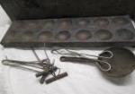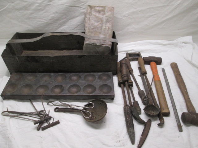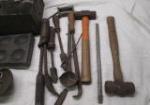 Large assortment of tools utilized for metallurgy. These tools include files, hammers, a metallurgist apron, cast iron dippers and more.