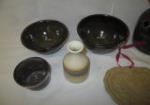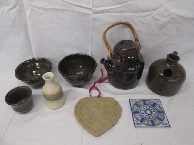 This darling assortment of stoneware pieces includes a teapot with a bamboo handle, an antique stoneware jug. (This type of jug is sometimes referred to as a "beehive" jug), three small stoneware bowls and more. These items are in used, good condition. Please preview.