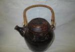 Darling assortment of stoneware pieces including a teapot with a bamboo handle, an antique stoneware jug. This type of jug is sometimes referred to as a "beehive" jug., small stoneware bowls and more.