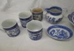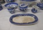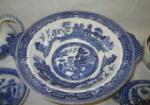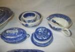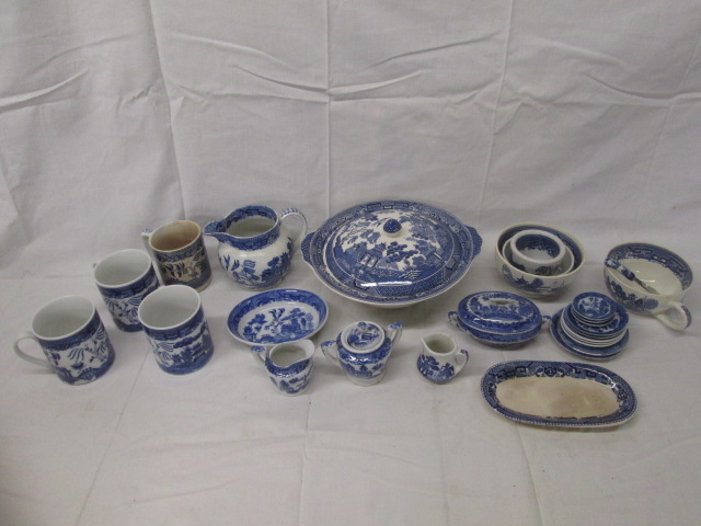 Nice assortment of fifteen pieces of transfer white and blue flow (Blue Willow) porcelain including a 10" covered vegetable terrain in the classic Blue Willow pattern, a, sugar, a 1924 soap dish, four coffee cups, a creamer, and more.