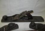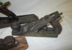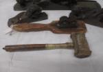 This selection of five vintage tools includes three wood plains, a wooden mallet, and a home-made knife sharpener. These items are in used, good condition. Please preview.