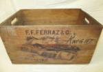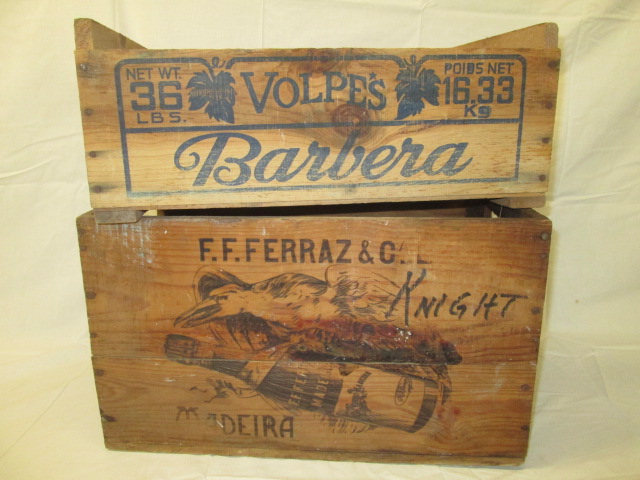 This nice pair of vintage wooden advertising crates features a Volpe Barbera grape crate and a F.F. Ferraz & C0. Madeira wine crate. These items are in used, good condition. Please preview.