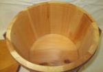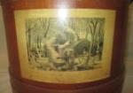 Vintage 11" Firkin (smaller of the 2) is a type of small wooden bucket or barrel. Firkins were historically used for storing dry goods such as sugar, flour, or butter. This item has a Currier and Ives image featuring a maple sugar tapping on the front.