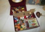 This darling assortment of miniature doll house items includes stoneware and metal kitchen items, dogs, food, and more. These items are in used, good condition. Please preview.