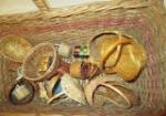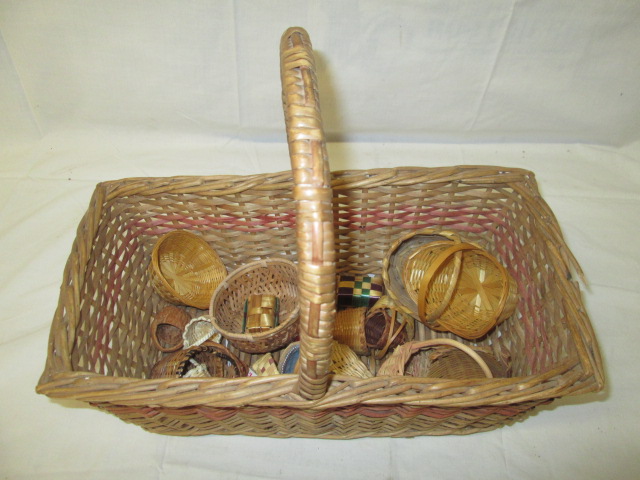 This basket holds twenty miniature doll house baskets . The basket and contents are in used, good condition. Please preview.