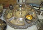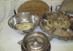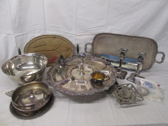 This large assortment of sixteen pieces of silver plate includes a large ornate 19-1/2" Lazy Susan, a large bowl, a large ladle, a beautiful pair of 9" candle sticks and more. These pieces are in used, good condition. Please preview.