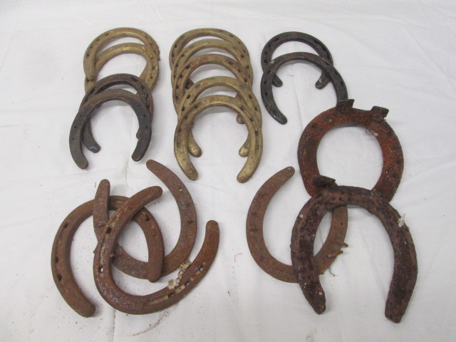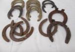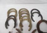 This collection of seventeen horseshoes includes some used for traction on ice. These shoes include various types and are in varying conditions. Please preview.