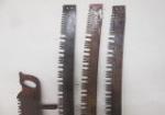 Assortment of four vintage saws including blades from three, two-person symmetrical saws also known as "misery whips" and a crosscut saw.