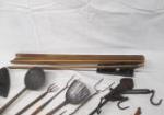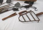 This wonderful collection of antique household tools includes a wooden wall clothes drying rack, two cast iron "sad" irons, an iron trivet with a wooden handle, a steelyard balance scale and more. These items are in antique, good condition. Please preview.