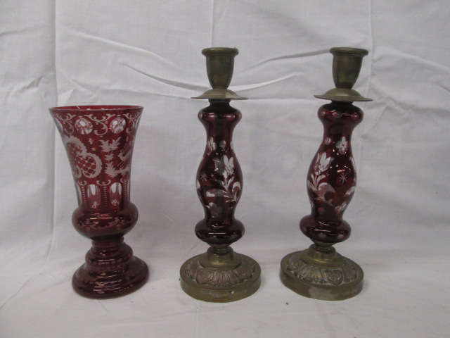 Gorgeous trio of Bohemian decor glass items including a 9" Egermann Bohemian ruby red cut vase, and a beautiful pair of Bohemian ruby red cut glass candle sticks with metal bases.