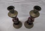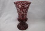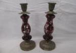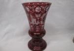 This gorgeous trio of Bohemian decor glass items includes a 9" Egermann Bohemian ruby red cut vase, and a beautiful pair of Bohemian ruby red cut glass candle sticks with metal bases. These items are in good condition. Please preview.