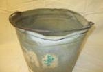 Selection of metal items including two metal ash pails, a large 14" metal pan and a small metal enamel pan.