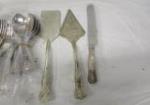 Large, over sixty, assortment of stainless steel/silver plate utensils from a variety of patterns. These items include a FB Rogers Berry pattern serving spoon, items with the Sheffield Berry pattern, a silver plate King's Pattern cake server, and more.