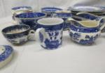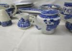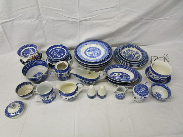 This nice assortment of over fifty pieces of transfer white and blue flow (Blue Willow) porcelain includes a pair of salt and pepper shakers, a creamer, a gravy boat, two large mugs, five mis-matched dinner plates, saucers, small serving bowls and more. Several of these pieces have wear and chips due to age. Please preview.