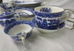 Nice assortment of over fifty pieces of transfer white and blue flow (Blue Willow) porcelain including a pair of salt and pepper shakers, a creamer, a gravy boat, two large mugs, five mis-matched dinner plates, saucers, small serving bowls and more.