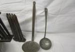 Let there be light! Great assortment of candle making items including three tin candle molds (one has been transformed into a table light). Other items include two vintage skimmers, a metal colander, four metal food choppers (mezzalunas) and an antique match holder.