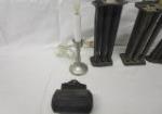 Let there be light! Great assortment of candle making items including three tin candle molds (one has been transformed into a table light). Other items include two vintage skimmers, a metal colander, four metal food choppers (mezzalunas) and an antique match holder. These items are in vintage, good condition. Please preview.