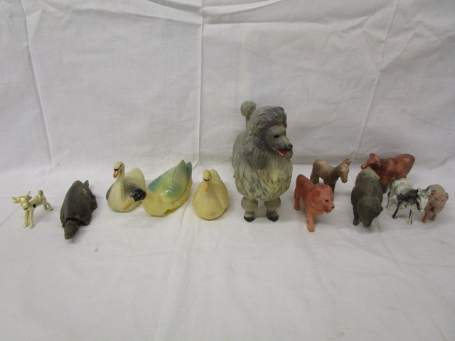 Whimsical collection of fifteen vintage plastic toy animals including a cow, a dog, a sheep, a swan and more.