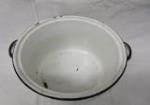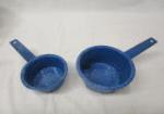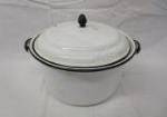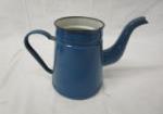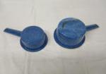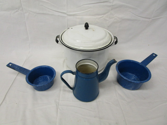 This set of enamel cookware includes a covered pot, two small sauce pots and a small tea pot (missing its top). These items are in used condition. Please preview.