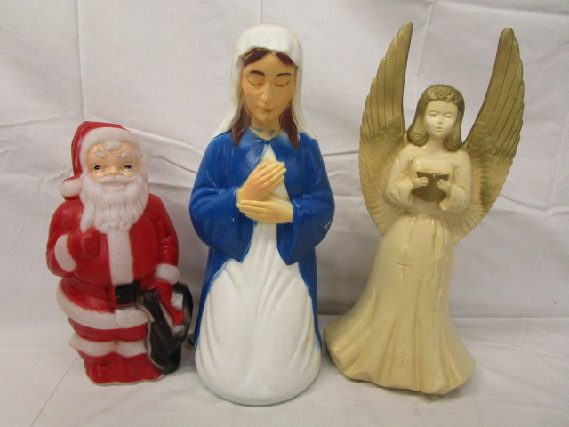 This miscellaneous trio of Christmas decor includes a vintage blow mold Santa Claus 13", a vintage Empire blow mold figure of Mary from a nativity scene (18") and a lovely mold of an angel with golden wings (18"). These items are in used, good condition. Please preview.