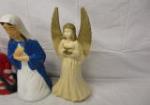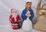 Miscellaneous trio of Christmas decor including a vintage blow mold Santa Claus, a vintage Empire blow mold figure of Mary from a nativity scene and a lovely mold of an angel with golden wings.