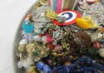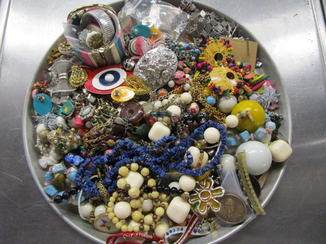 Interesting collection of miscellaneous costume jewelry featuring an Eastern Star necklace, an ivory style necklace, a blue stone necklace, earrings, beads and more.