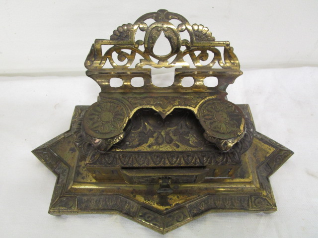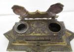 Heavy, antique 5" cast metal Bradley and Hubbard double inkwell and pen stand (model # 6062).