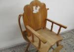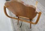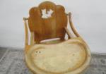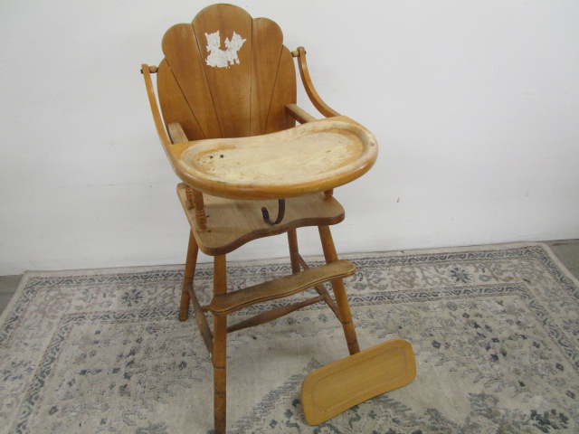 Antique Lehman "Baby Guard" wooden high chair featuring a distinctive scalloped or shell-shaped backrest and wide wrap around wooden tray. This chair has a Scottie dog decal on the backrest of the chair.