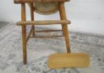 This antique Lehman "Baby guard" wood high chair features a distinctive scalloped or shell-shaped backrest and wide wrap-around wooden tray. This chair has a Scottie dog decal on the backrest of the chair. This chair measures 14" W X 17" D X 41"H. This item does show some wear due to use but is in sturdy condition. Please preview.