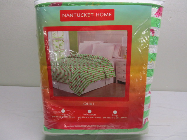 Nantucket Home full / queen size quilt, new in package. Green and white striped with all over flamingo print. Brand new in package, never opened. Excellent condition, please preview.