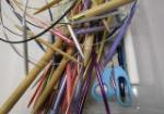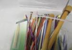 Assortment of knitting needles including various sizes. The assortment includes wooden and metal needles.