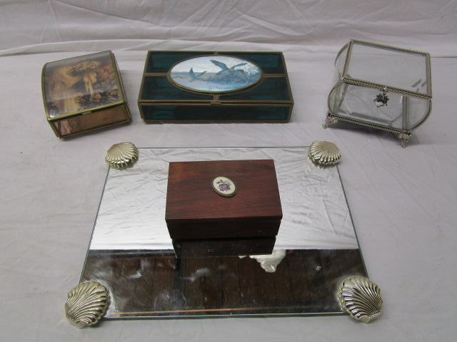 Assortment of vintage home decor items including four trinket boxes and an 8-1/2" X 12" mirror with a shell motif.