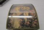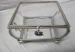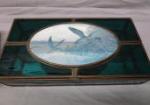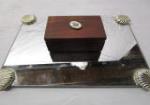 This assortment of vintage home decor items includes four trinket boxes and an 8-1/2" X 12" mirror with a shell motif. The collection of trinket boxes includes a Via Vermont teal glass box with a duck motif, a wooden "Purple Heart" box, a Cynthia Rowley clear glass box and an Enesco Mexican, wedding trinket box. These items are in previously owned, good condition. Please preview.