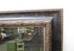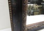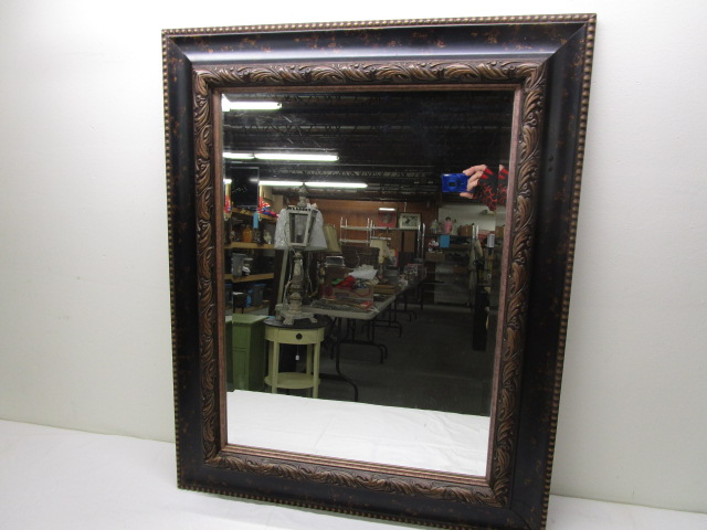 This stylish 25" X 32" decorative mirror features a lovely dark frame. This item is in previously owned, good condition. Please preview.
