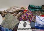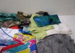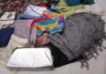 Lovely selection of accessories including over twenty scarves, a shawl, a cloth hair bow and a silver clutch. purse.
