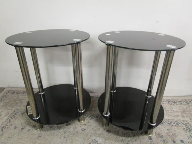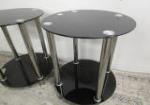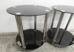 This pair of modern two tier black, tempered glass and chrome end tables measure 16"W X 20"H. One of the tables has some light, surface scratches and a small indentation in the chrome leg. These items are in previously owned condition. Please preview.