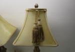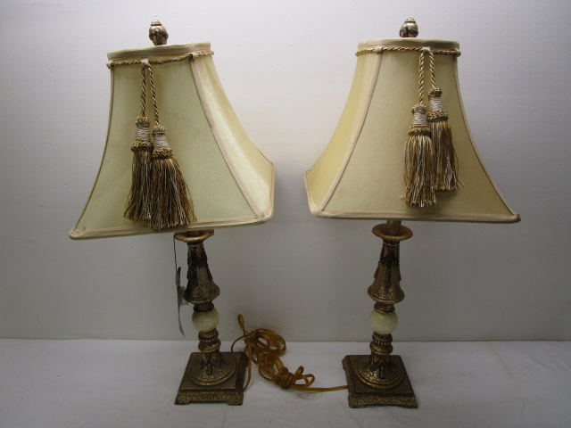 This lovely pair of 28" Stylecraft brand table lamps feature ornate gold toned bases, marble accents and tassel lampshades. These items are in previously owned, good condition. Please preview.