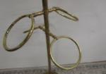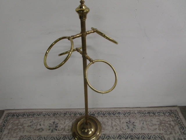 Vintage 39" Hollywood regency style brass four ring stand designed to hold towels or scarves.