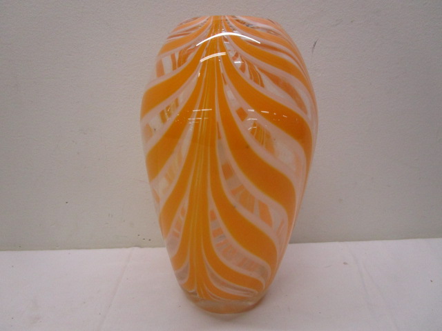 Beautiful Mid century Modern 10-1/2" Murano style orange and white vase featuring a "ribbon" pattern.