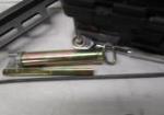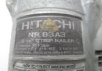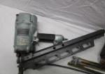 Assortment of tools including a Hitachi 3-1/4" Strip Nailer (model # 83A3), a plumber's "snake", a Shideli tool box (including eight tools of various sizes) and a manual level action grease gun.
