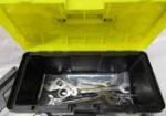 This assortment of tools includes a Hitachi 3-1/4" Strip Nailer (model 83A3), a plumber's "snake", a Shideli tool box (including eight tools of various sizes) and a manual level action grease gun. These items are in previously owned condition. Please preview.