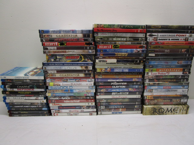 This Large collection of over seventy DVD's, eleven Blue Ray DVD's, and three HD-DVD's includes a variety of genres and titles. Titles include "Troy", "Bad Girls", "Peter Pan", "Gladiator" and more. These items are in previously owned condition. Please preview.
