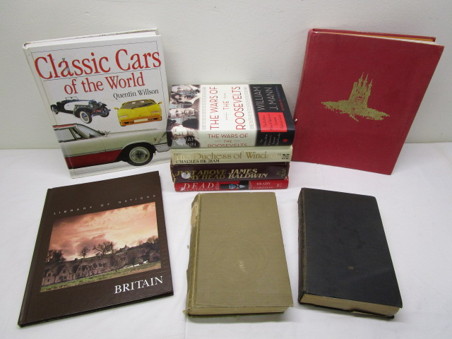 Assortment of nine hard cover books including a 1922 copy of "The Real Tsaristsa by Madame Lili Dehn, The Locomotive God by William Ellery Leonard, "The Wars of The Roosevelts", "The Duchess Of Windsor" by Charles Hingham and more.