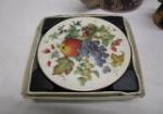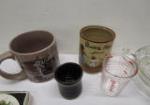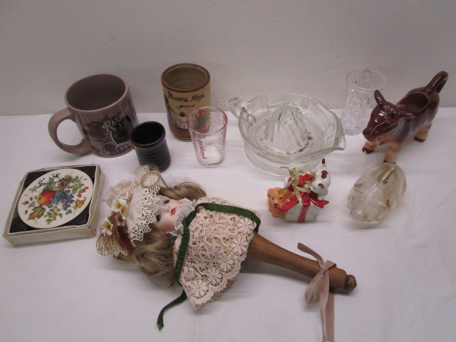 This collection of miscellaneous vintage items includes a Schmid brand 9" porcelain Victorian doll head on a stick, a vintage ceramic cow pitcher, a clear Hazel-Atlas citrus juicer, an Avon brand 2006 collectible cat/dog Christmas ornament, a Cape Cod Railroad souvenir cup, a set of vintage Pimpernel round coasters and more. These items are in previously owned condition. Please preview.