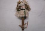 Collection of miscellaneous vintage items including a Schmid brand 9" porcelain Victorian doll head on a stick, a vintage ceramic cow pitcher, a clear Hazel-Atlas citrus juicer, an Avon brand 2006 collectible cat/dog Christmas ornament, a Cape Cod Railroad souvenir cup, a set of vintage Pimpernel round coasters and more.