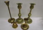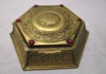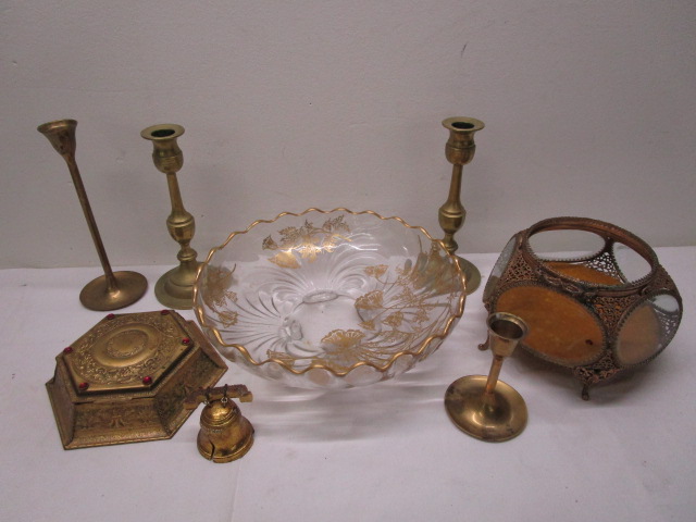 Lovely collection of vintage style brass and glass decorative items including four candle stick holders (one matching pair), a gorgeous vintage ormolu filigree jewelry "casket" featuring beveled glass, a Victorian-era jeweled jewelry box that once held LaTausca pearls and more.
