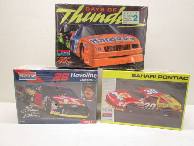 This trio of Monogram brand model car kits includes a 1:24 scale Bahari Pontiac (model #2932), a 1:24 scale 28 Havoline Thunderbird (model # 85-2471), and a 1:24 Hardee's Days of Thunder Lumina stock car model (model # 2920). These items are in new condition in sealed boxes. Please preview.