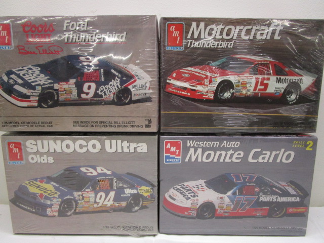 This collection of four AMT 1:25 scale model car kits includes the Sunoco Ultra Olds (model #6738), the Coors Light Ford Thunderbird (model # 6740) and the Western Auto Monte Carlo (model # 8404). These items are in new condition in sealed boxes. Please preview.