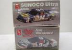 Collection of four AMT 1:25 scale model car kits including the Sunoco Ultra Olds (model #6738), the Coors Light Ford Thunderbird (model # 6740) and the Western Auto Monte Carlo (model # 8404).