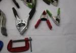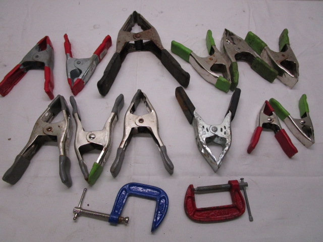 This selection of sixteen metal clamps includes fourteen spring clamps and two "C" clamps. These items are in previously owned condition. Please preview.